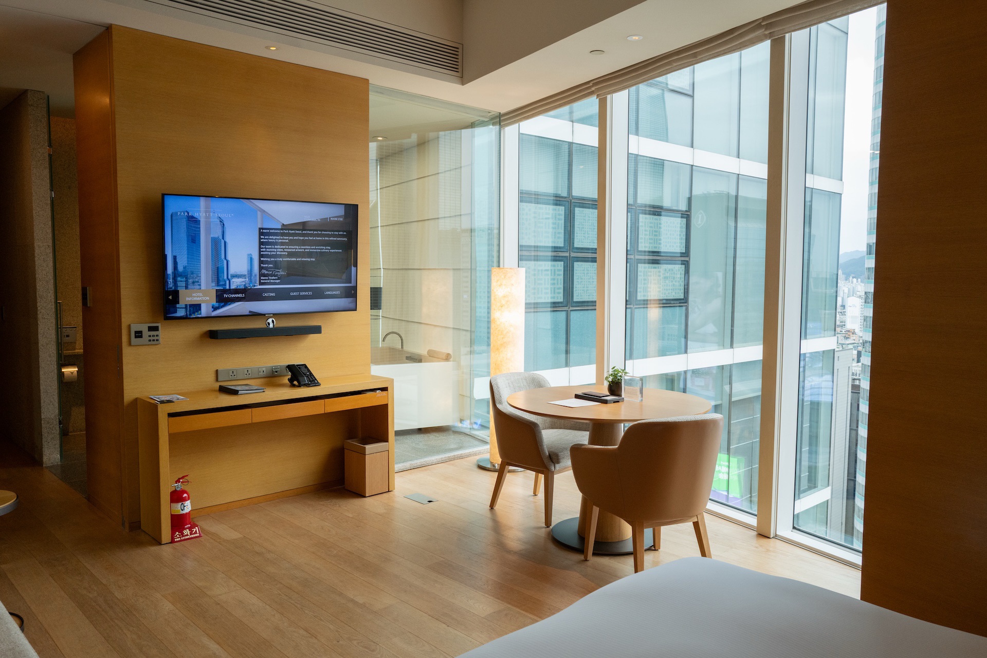 21階という高層フロアで、シェードを開けると大通りの大渋滞(汗)、複数の巨大な目がチカチカする電光パネル広告、そして開発中の工事現場が視界に広がります。決して景色をディスってるわけではなく.見た通りの景色を言っています(笑)。