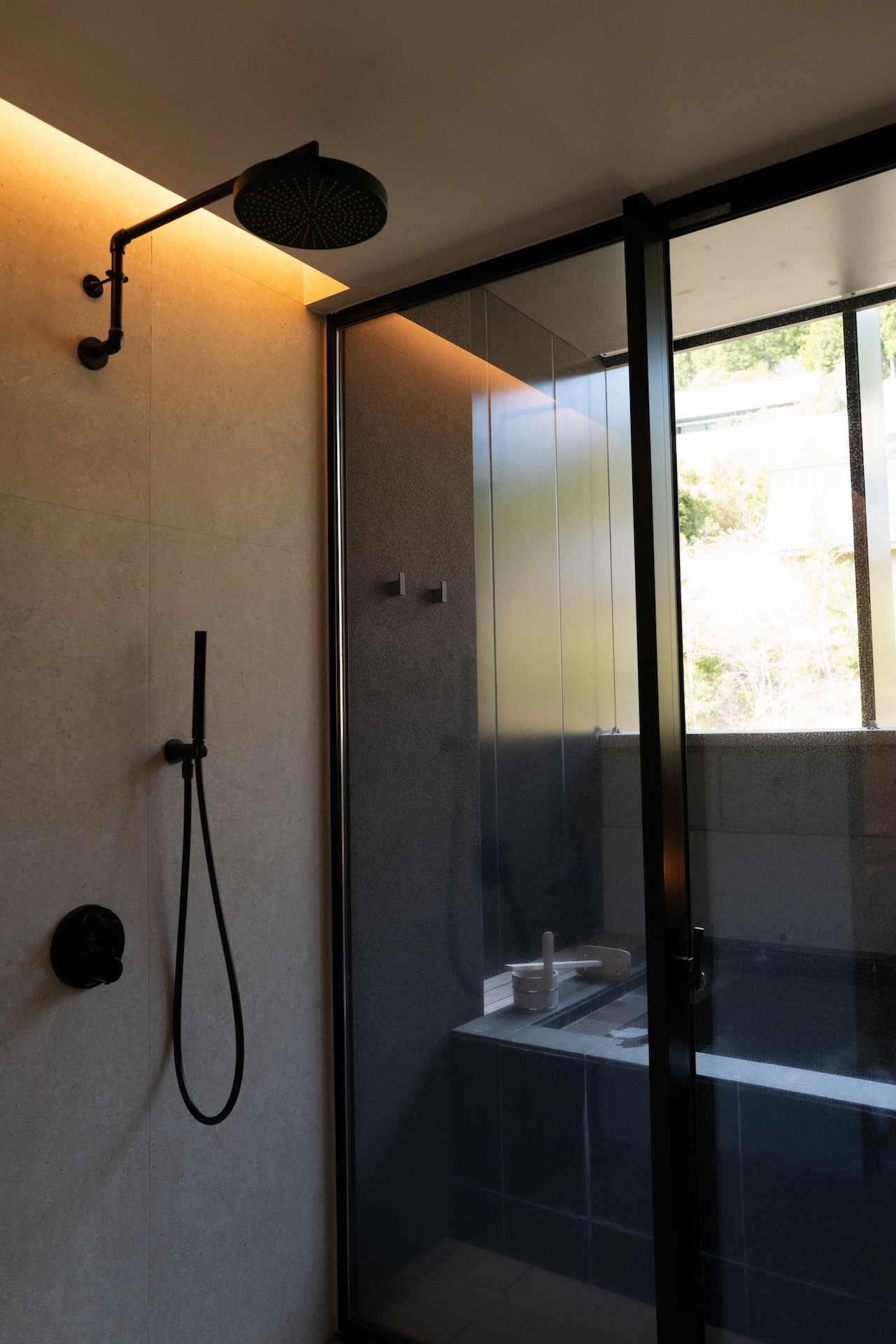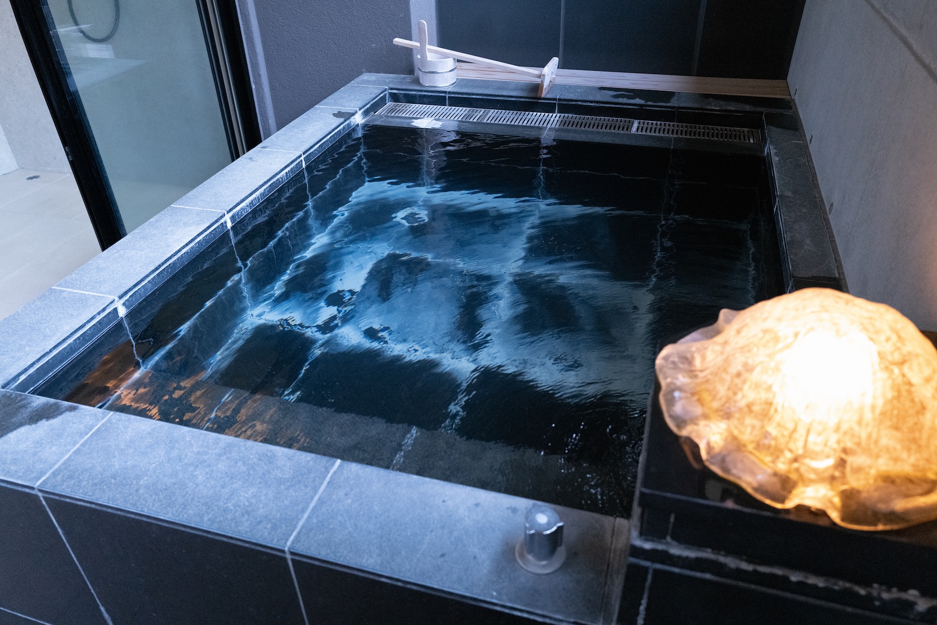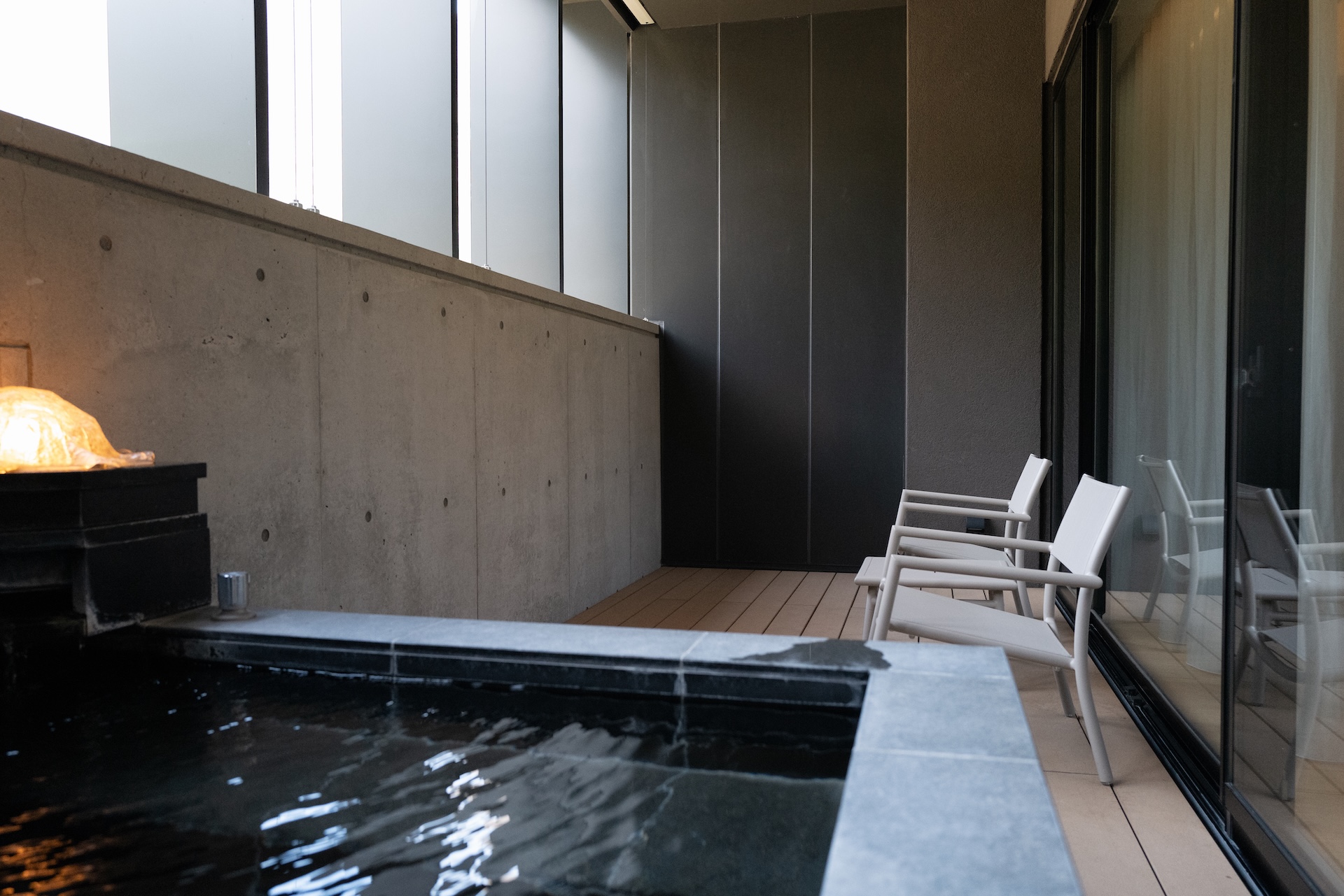 テラスにはスタイリッシュな半露天風呂が付いています。