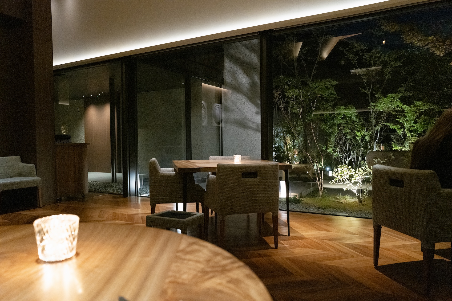 大きな窓の向こうにはライトアップされた庭が広がっていて、外と内の境界がやわらかく繋がっています。