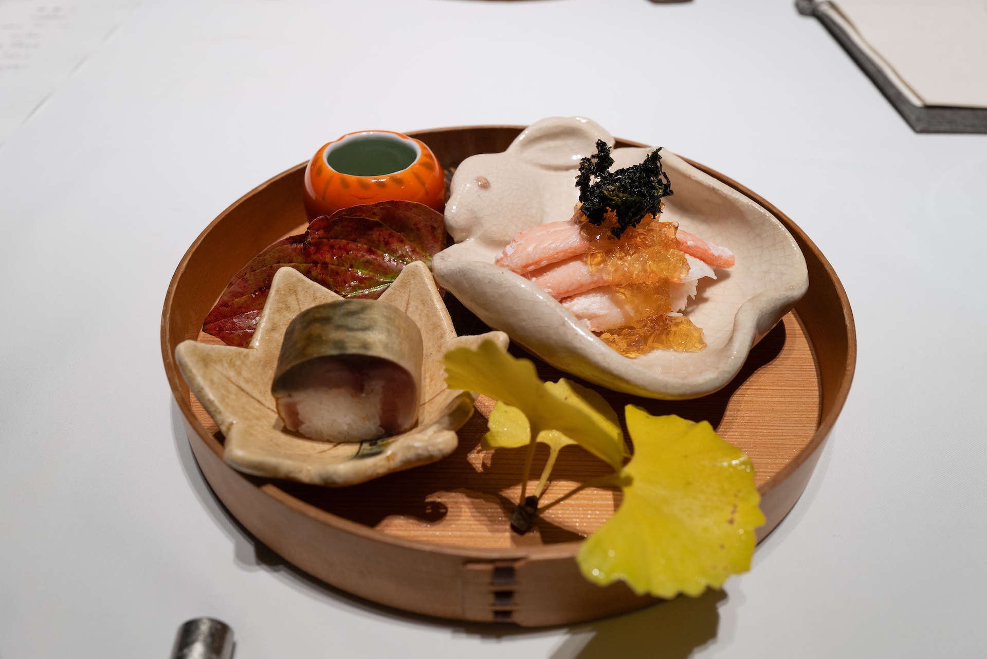 香ばしい鯖寿司、ぷるぷるの蟹身のジュレ掛け、そして銀杏。