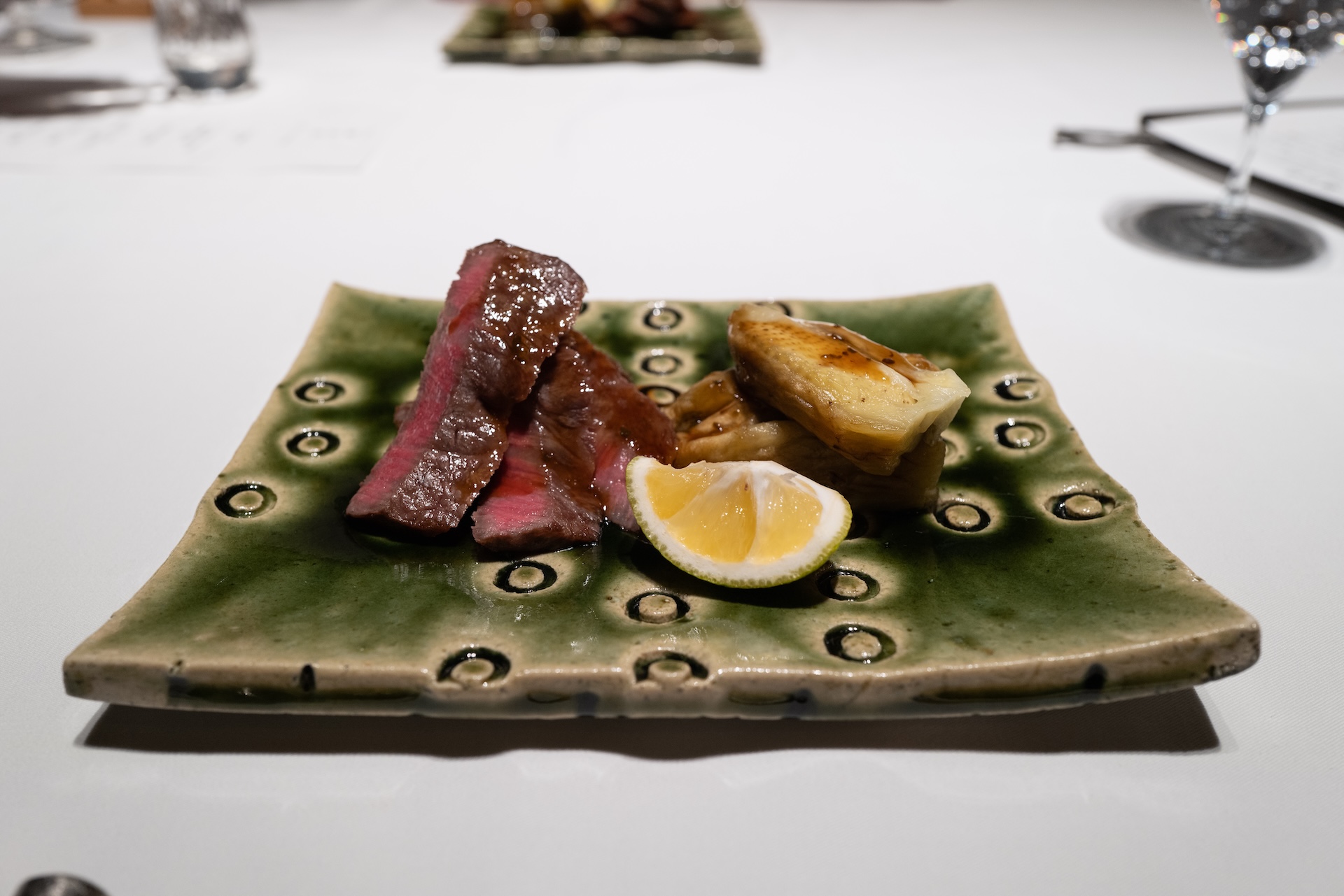 添えられた吉川茄子のとろりとした甘みと香りが、牛のコクをやさしく包み込む。