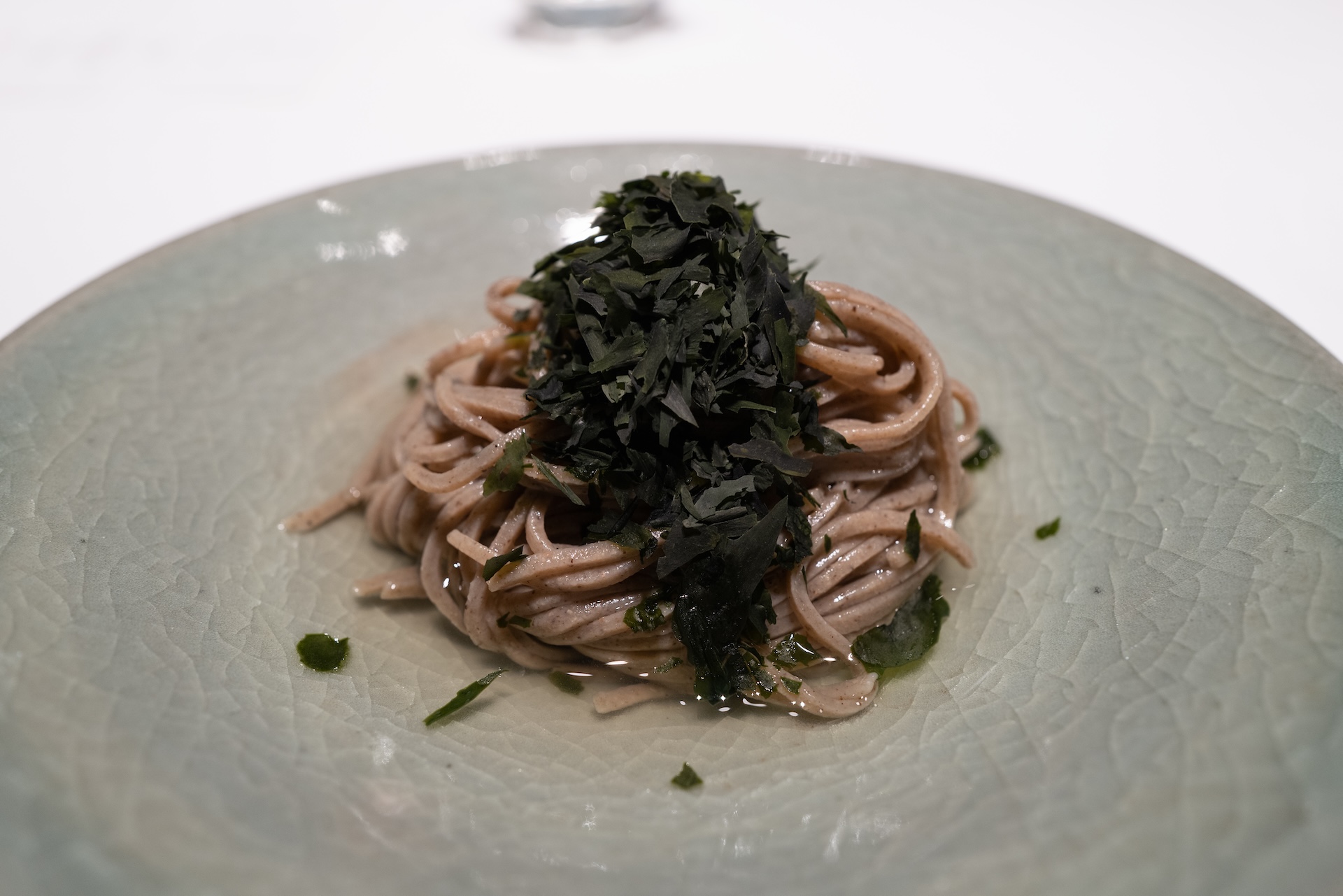 地元の名産品、乾燥若布がふわっと香る冷たいお蕎麦。