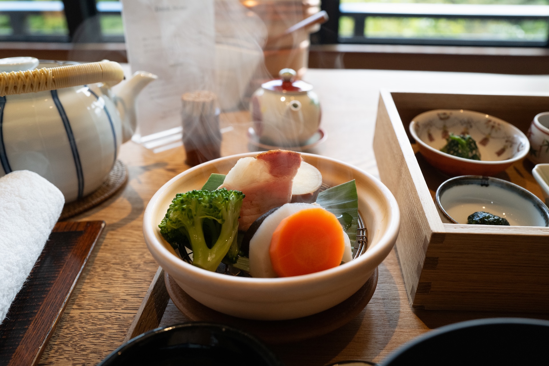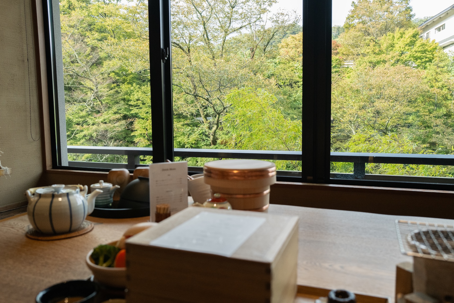 全てを食べ終えるころには、外の木々が柔らかな光に包まれていました。温泉宿で迎える朝は、どこか非日常的で、心身がすっと整っていくよう。