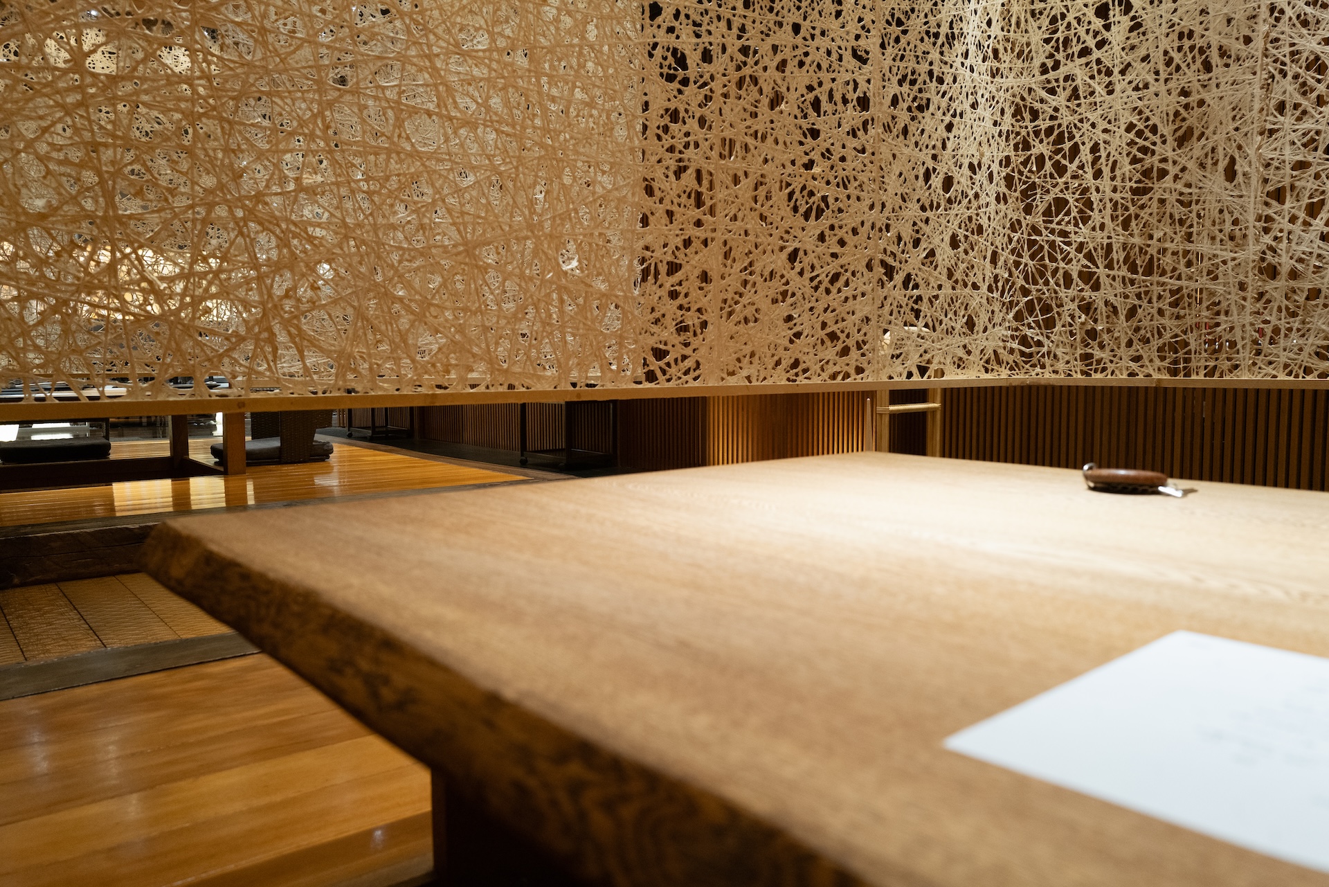 私たちが滞在しているスイートの洗練された空間とは対照的に、食事処〈にほん〉は土の質感や木の温もりに包まれた、心がゆるむような雰囲気でした。