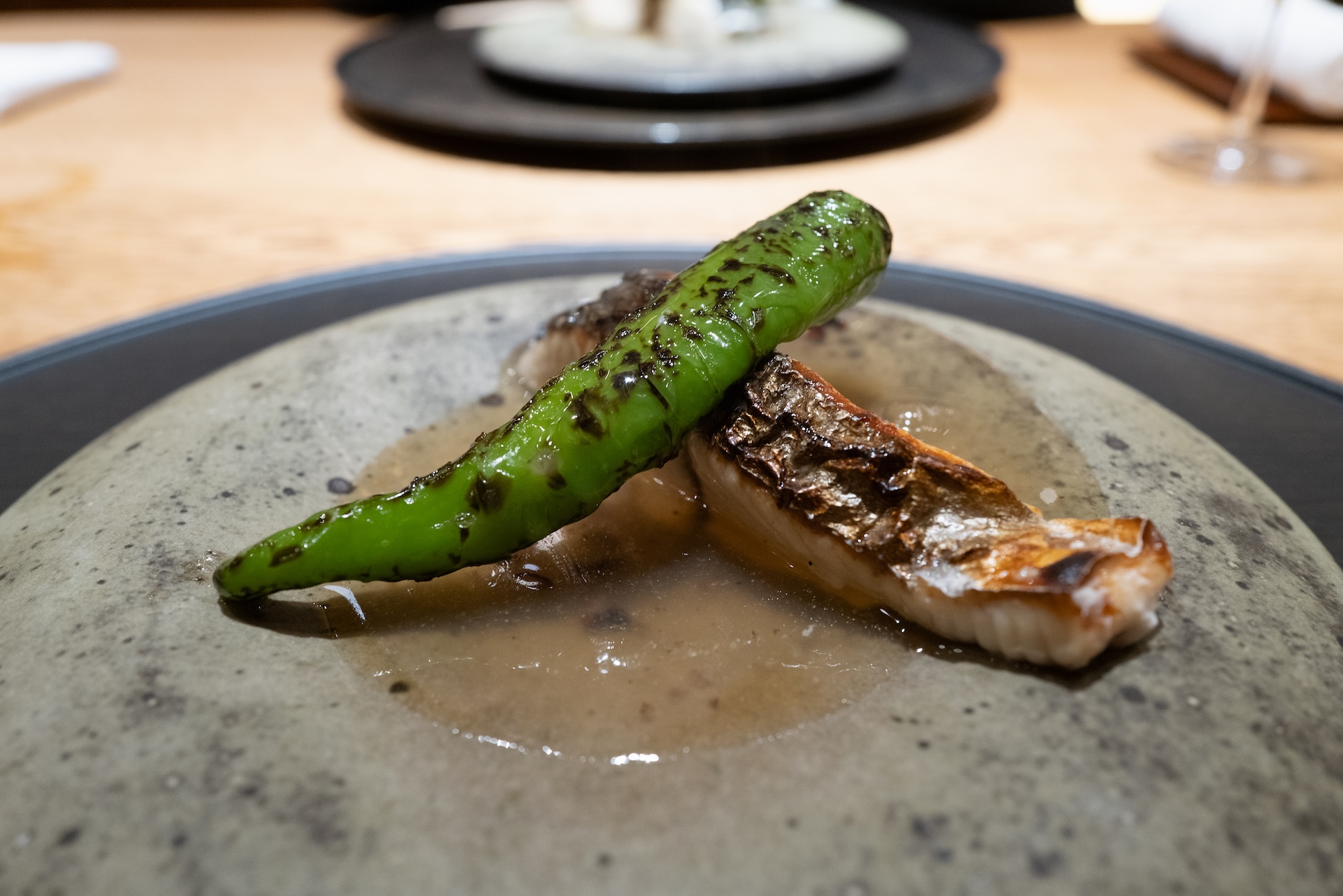 添えられた甘唐辛子が期待したよりも甘い。その甘みと香りがアクセントとなり、全体を引き締めている。