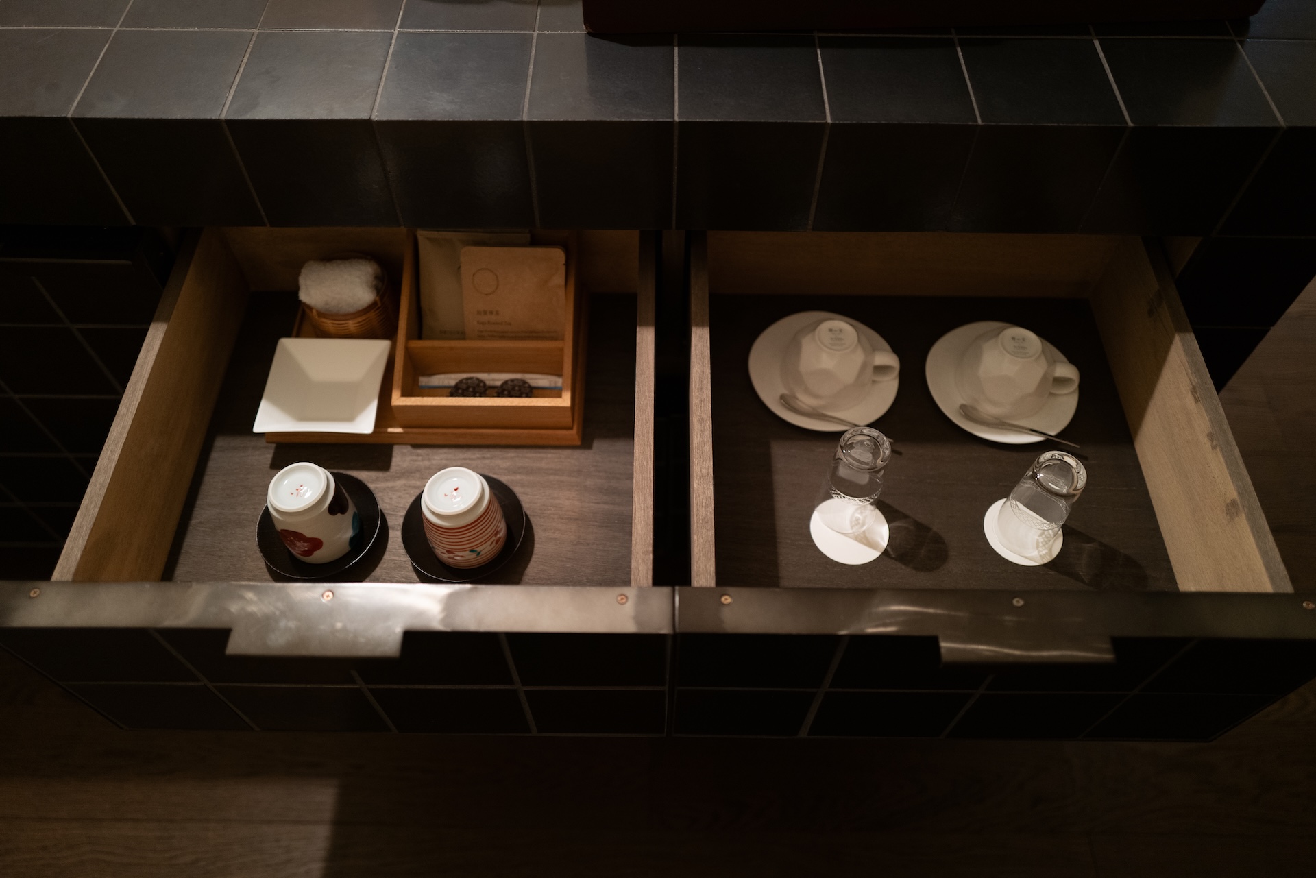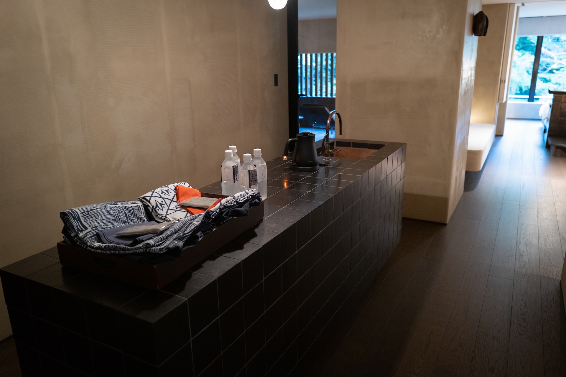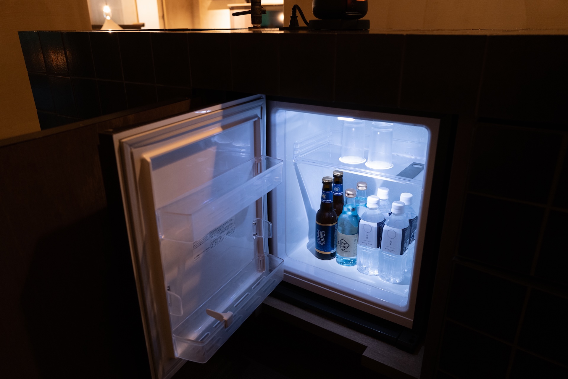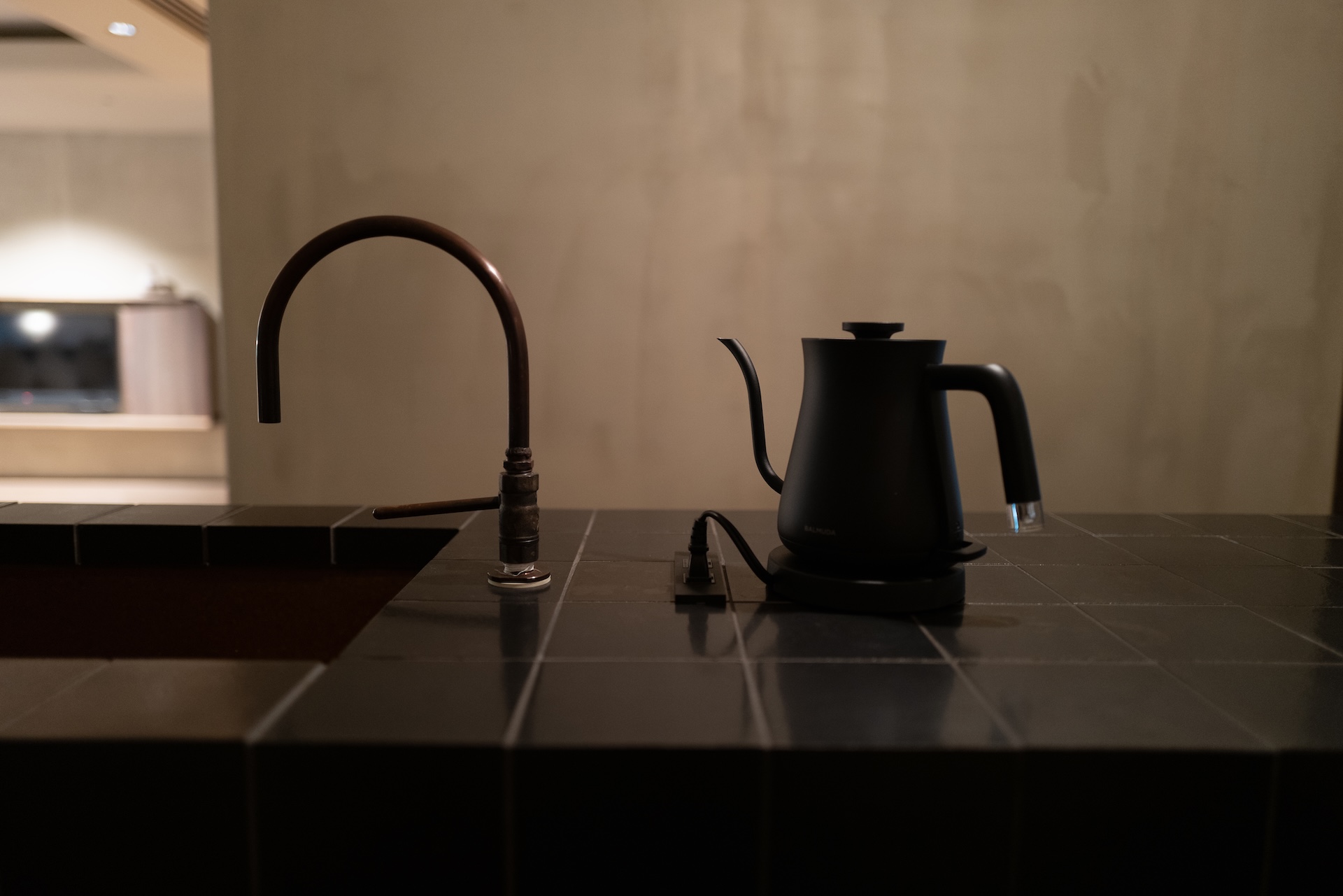 扉を開けるとバーエリア。黒タイルの光沢が印象的で、光が反射して“きらり”とする質感。照明が暗いぶん、タイルのテカリがアクセントになり、空間のメリハリを生んでいました。ここでコーヒーを淹れる時間さえ、ちょっとした“非日常”に。