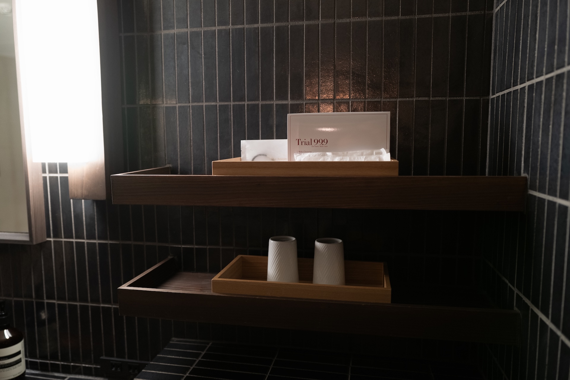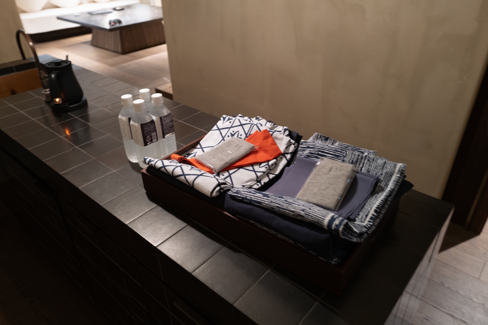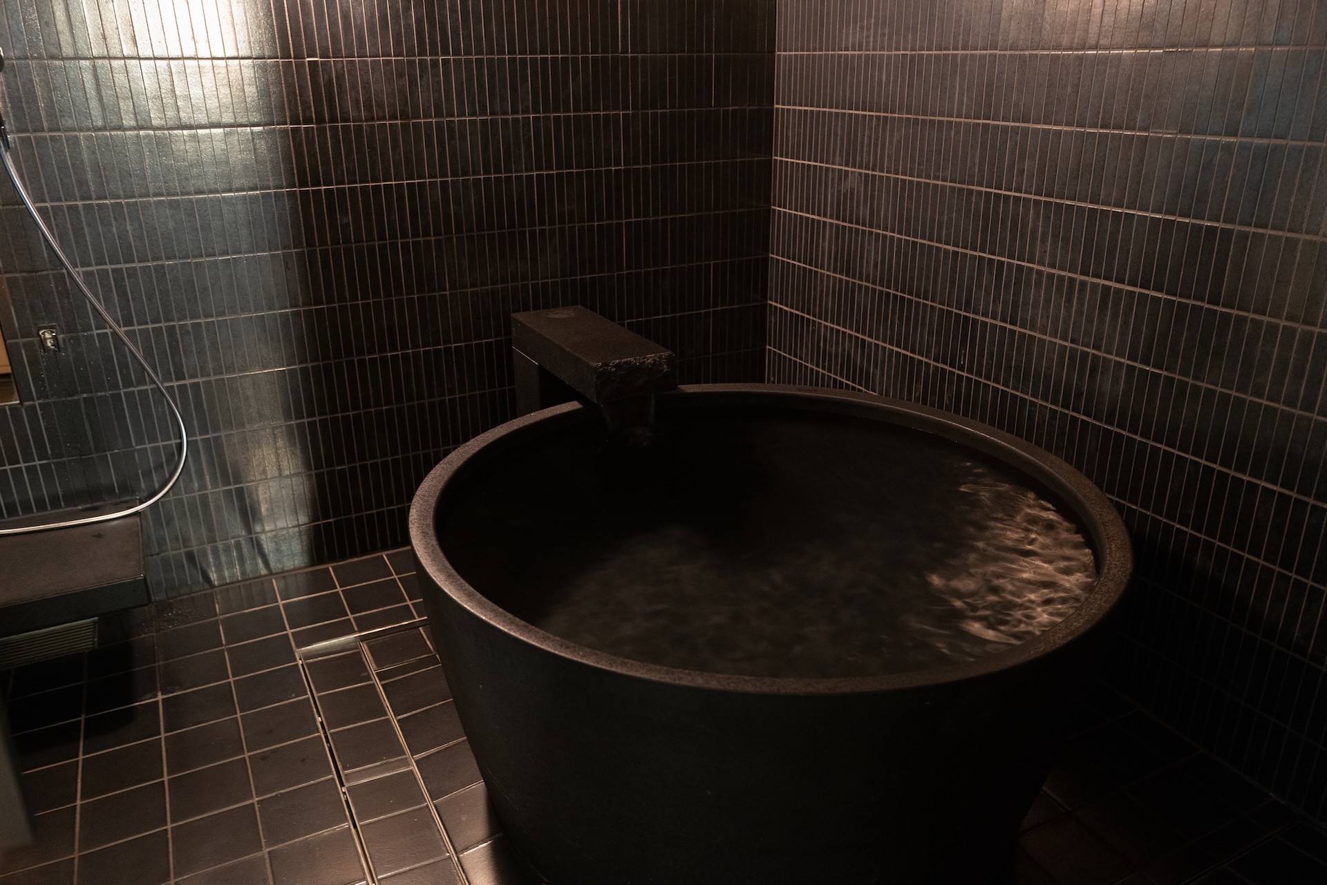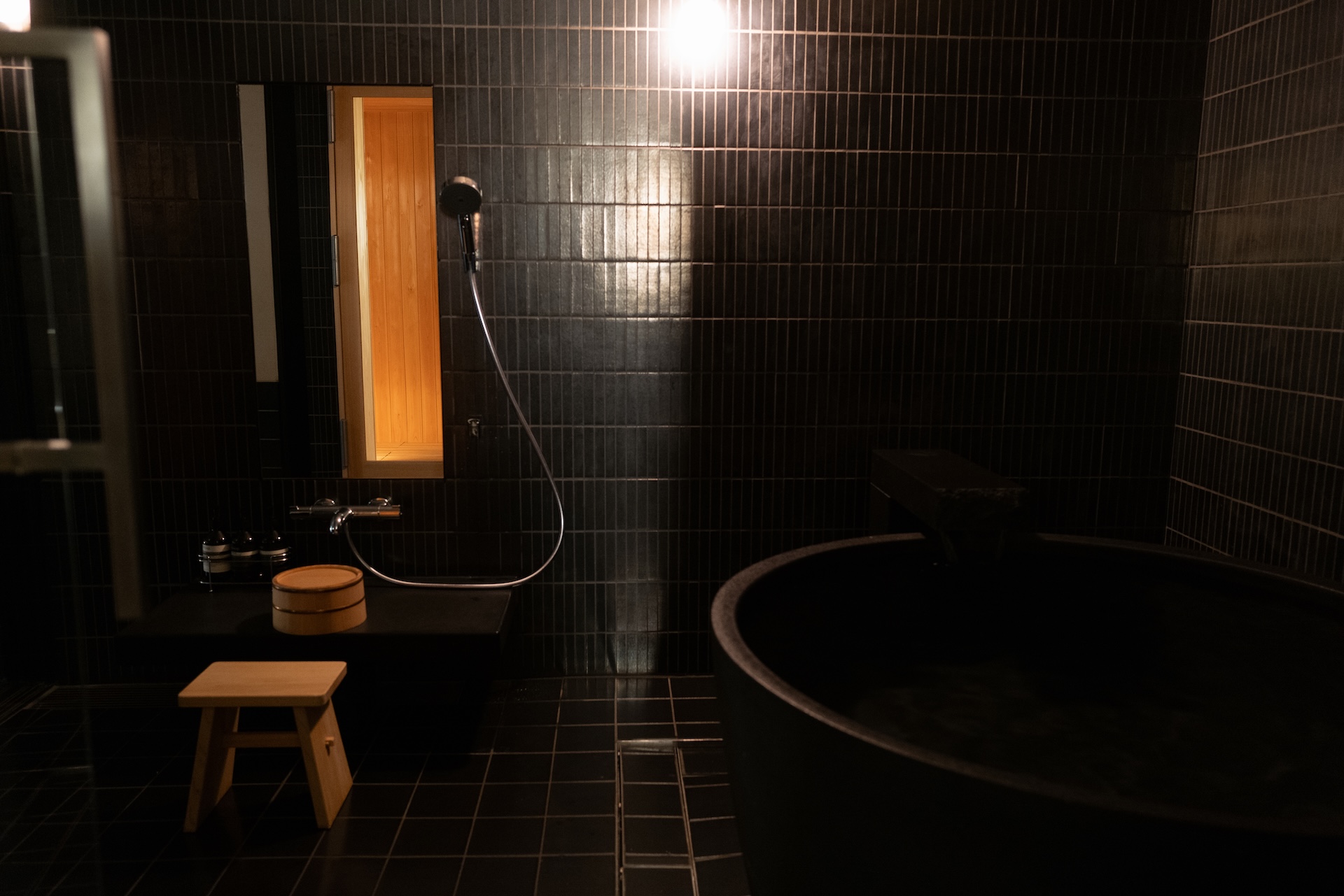 扉を開けるとバーエリア。黒タイルの光沢が印象的で、光が反射して“きらり”とする質感。照明が暗いぶん、タイルのテカリがアクセントになり、空間のメリハリを生んでいました。ここでコーヒーを淹れる時間さえ、ちょっとした“非日常”に。