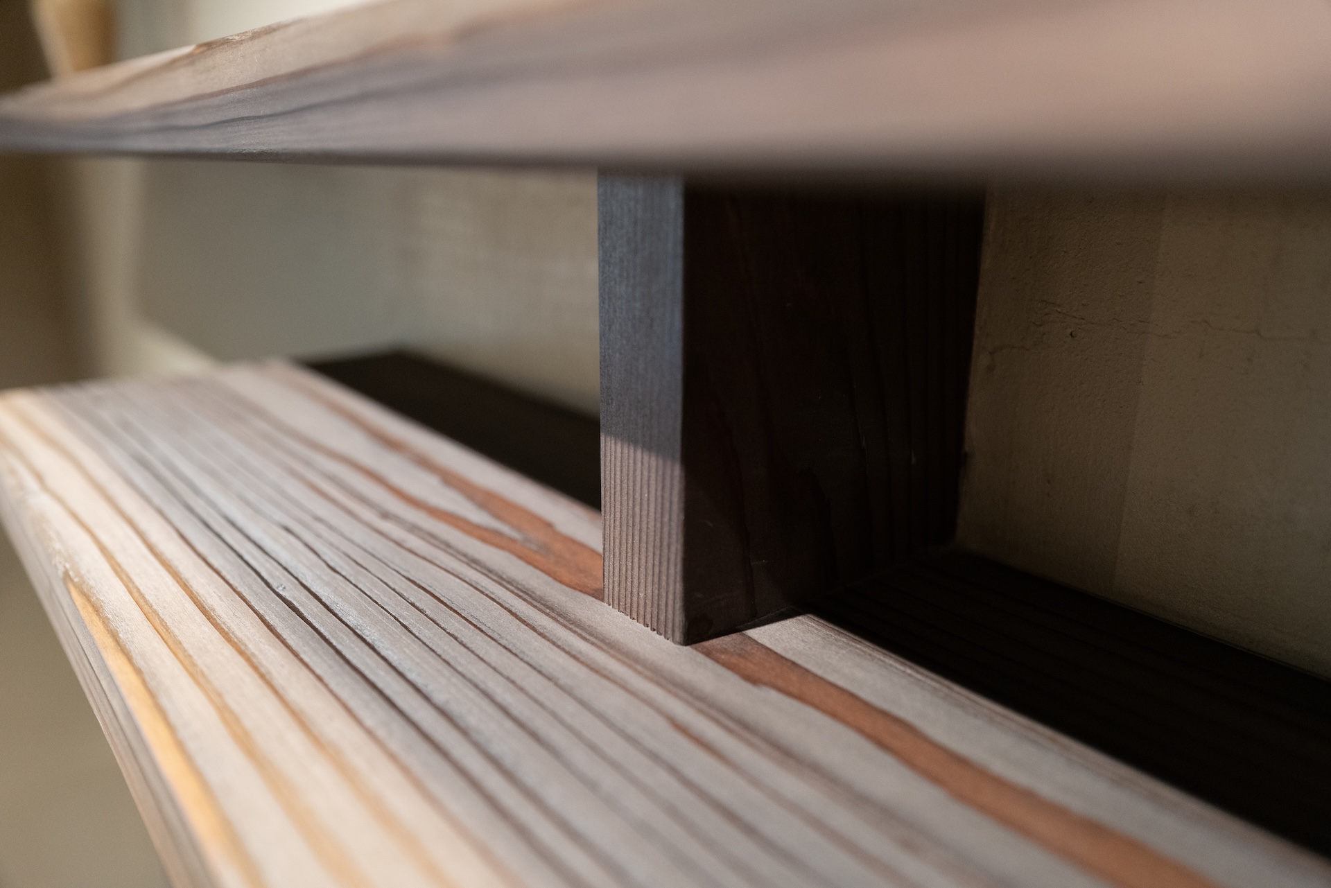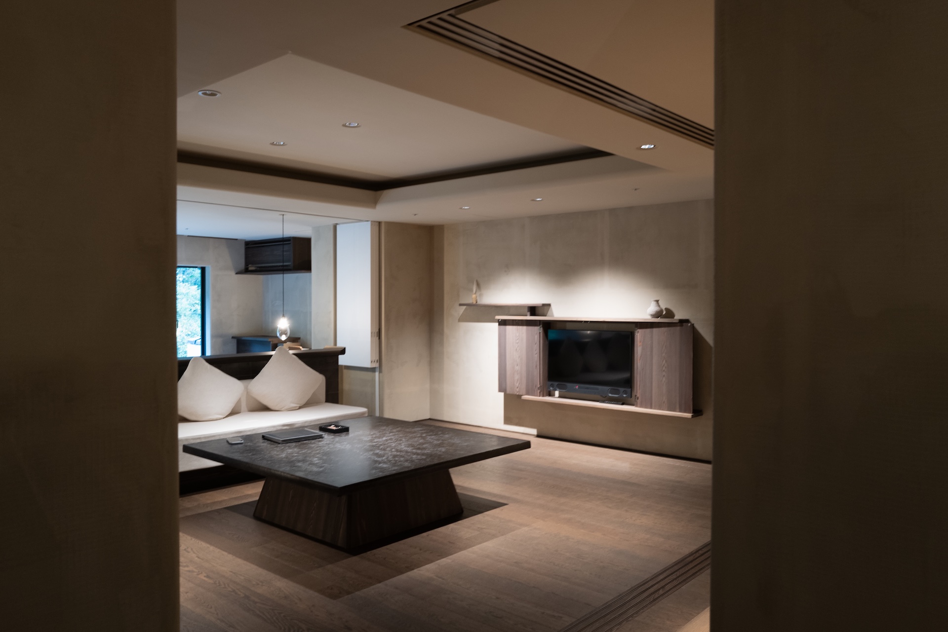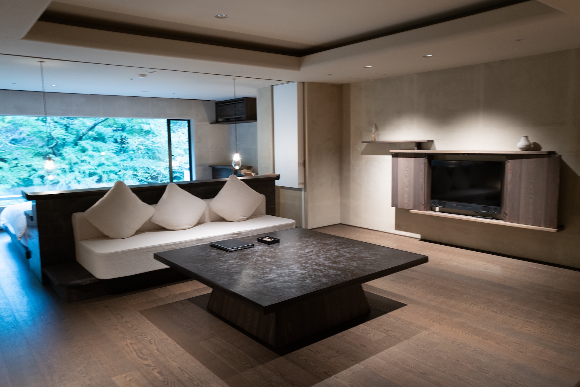 リビングエリアでは、まず中央のテーブルに目を奪われました。木材の温かみと存在感が絶妙で、正直「これだけで空間の格が上がる」と思えるほど。ソファは固めで長時間座ると腰にきますが、そのシャープさもまた空間の一部。テレビは小さめでしたが、扉で隠せる仕様になっていて、インテリアを崩さない工夫がされています。
