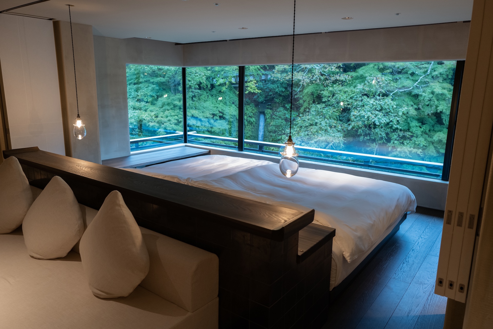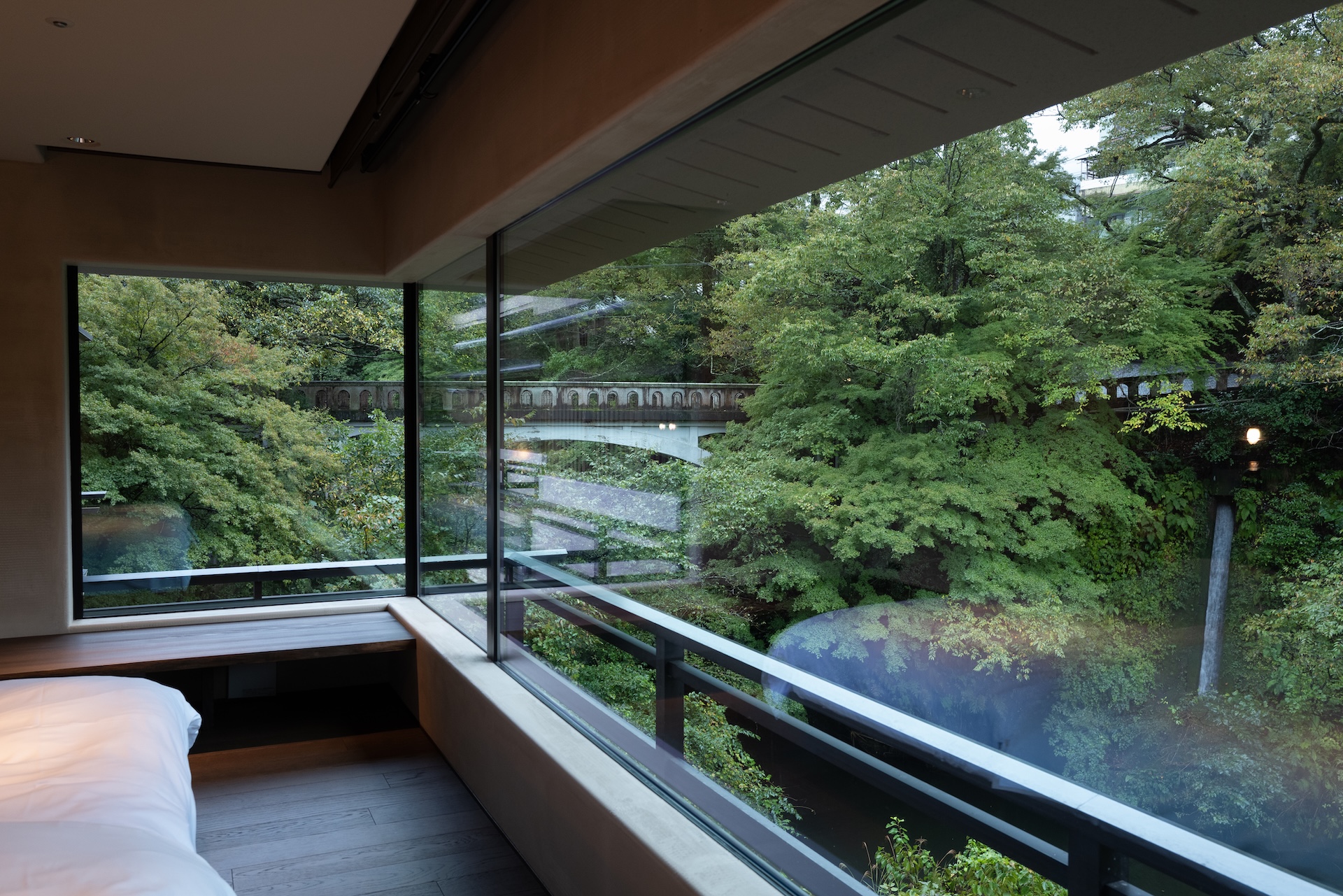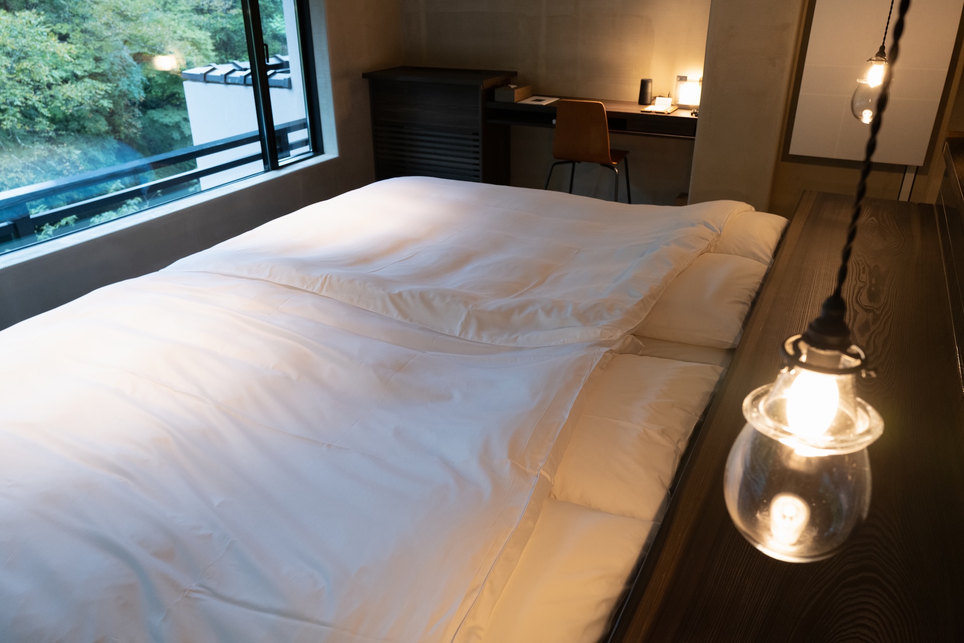 ベッドエリアは窓際いっぱいに広がり、川と緑を望む大きな窓が気持ち良い。ただし左手の窓は橋からの視線が少し気になる位置にありました。とはいえ、川面のせせらぎと緑の借景は旅館ならではの特権で、寝転がりながら自然と一体になる感覚が楽しめます。
