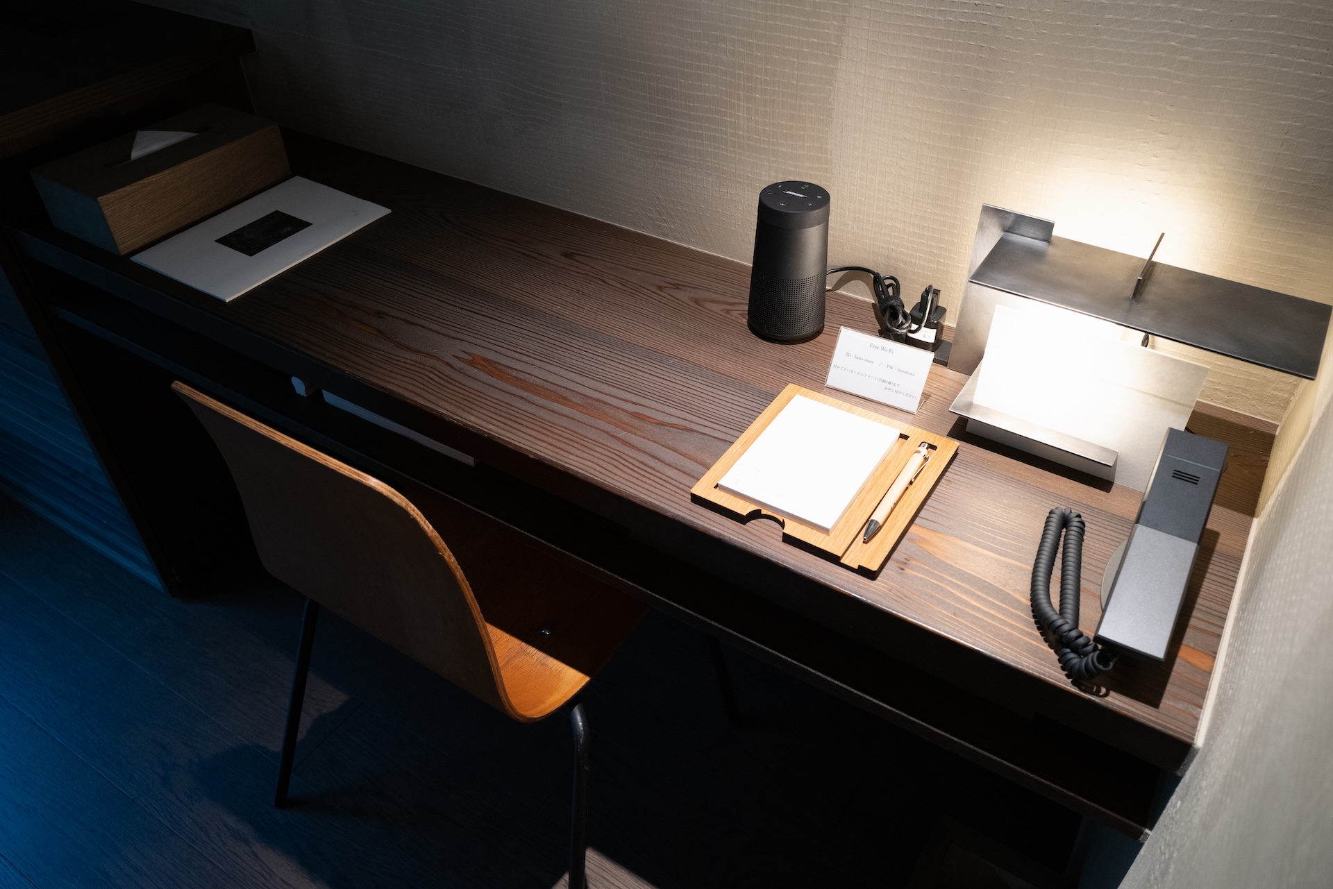 部屋の入口を入ってすぐに感じたのは「黒×ダークグレー」の落ち着いたトーン。照明は抑えめで、最初は暗い?と感じましたが、目が慣れるにつれ「奥行きのある陰影」として映ってきます。これは意図されたデザインだと思いました。