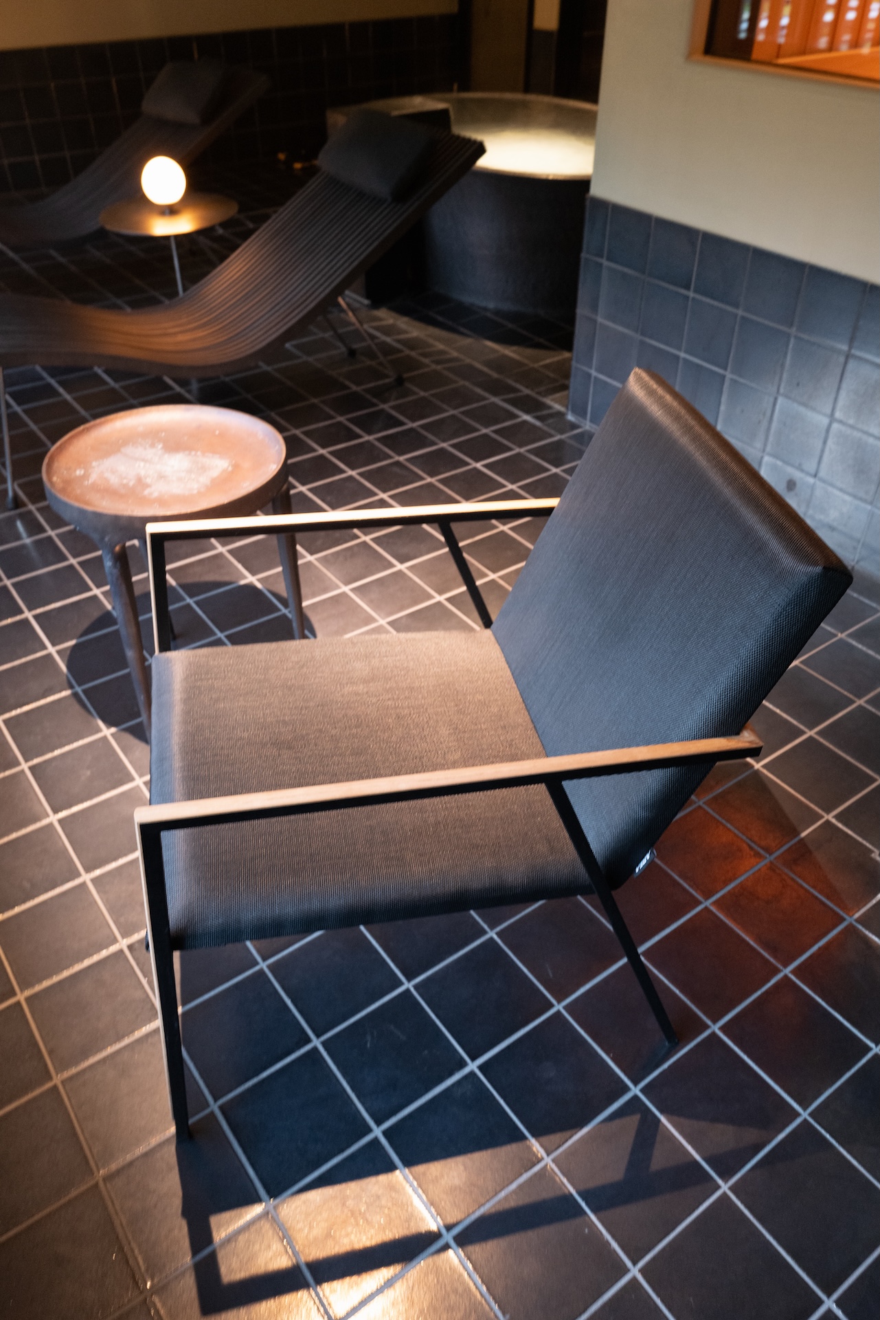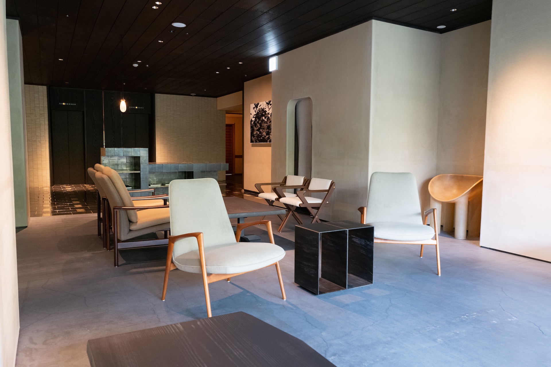 夏の5は2階に位置します。2階のエレベーター前にはリラクシングスペースがあり、こちらも同じトーンの雰囲気のインテリアでまとめられていて素敵🖤