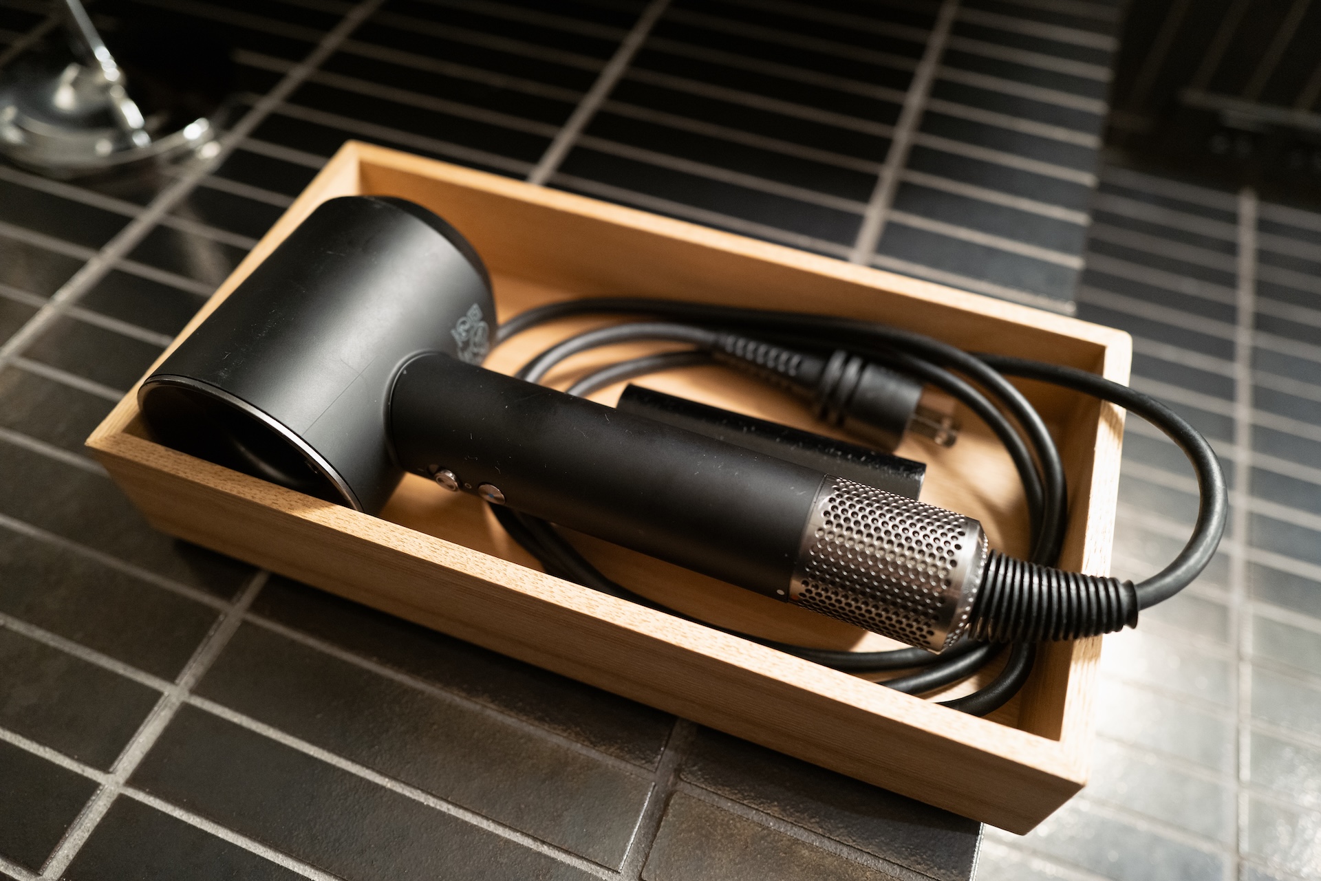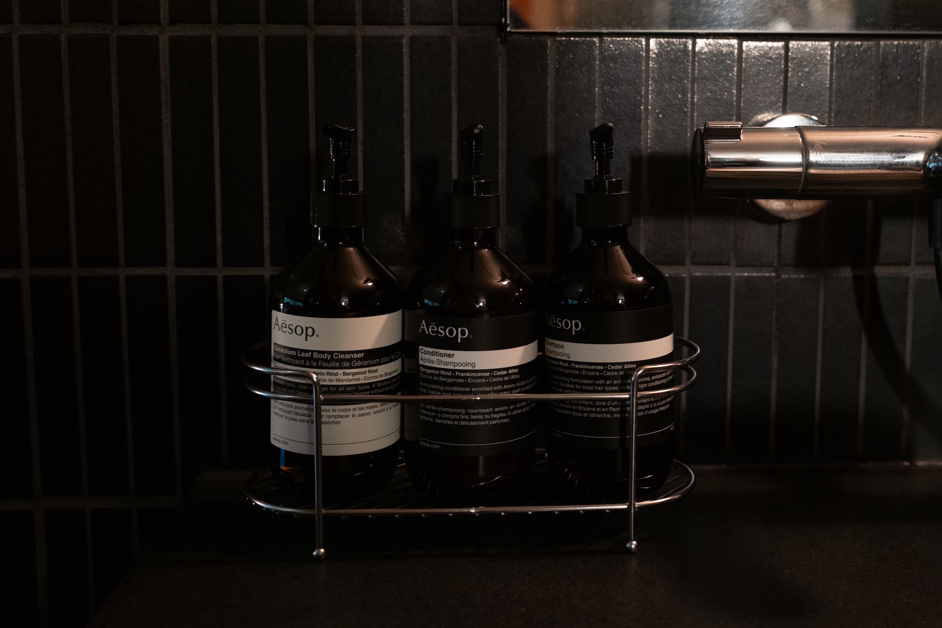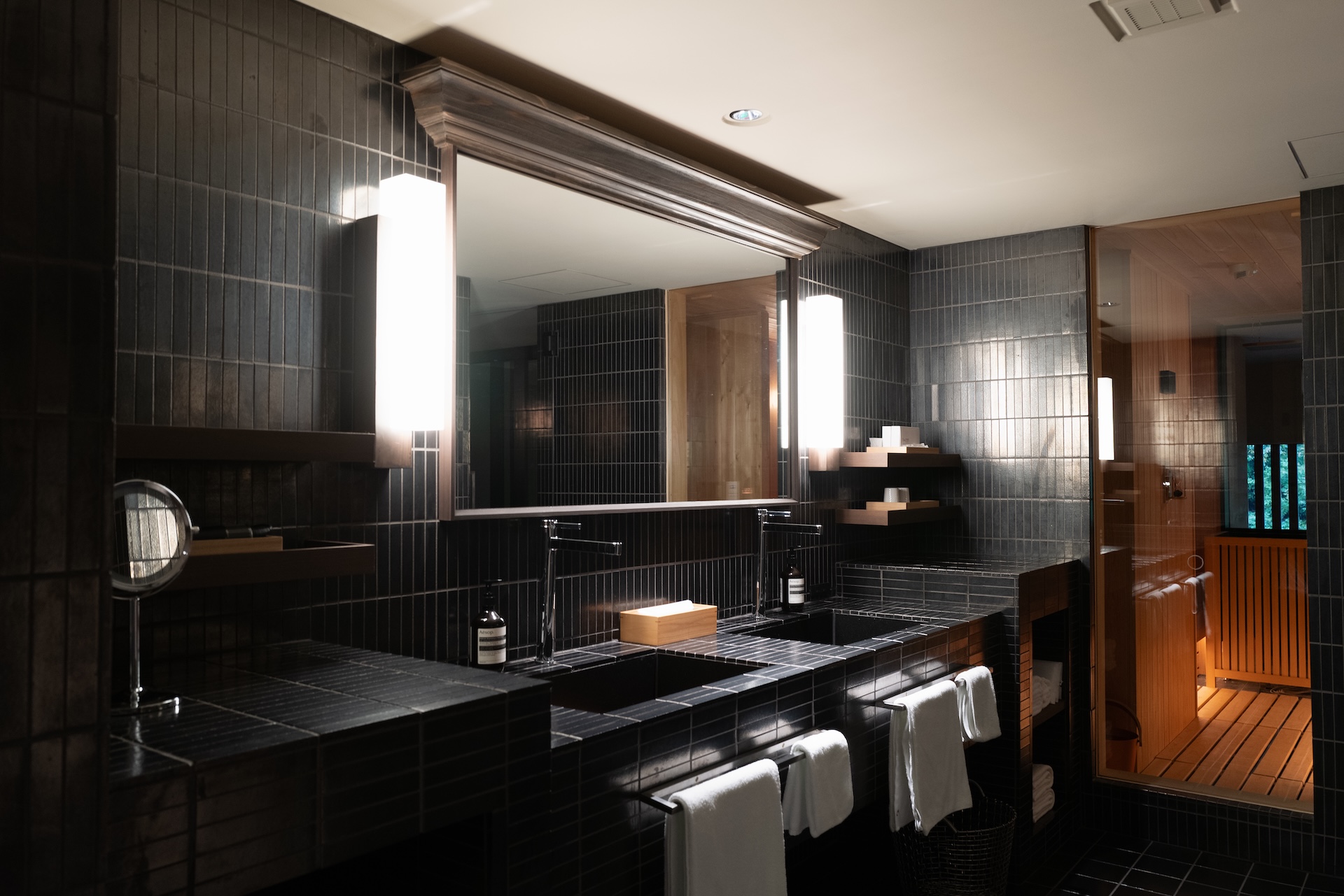 洗面台は黒タイルに銅板風のシンク。モダンでかっこいい反面、実用面ではやや重厚感が勝ちすぎる気も。ただ、アメニティがAesopというのはテンションが上がります。香りがいいとそれだけで「旅の気分が上がる」という方、多いはず。ドライヤーはDysonで、家と同じモデルだったので安心感も。
