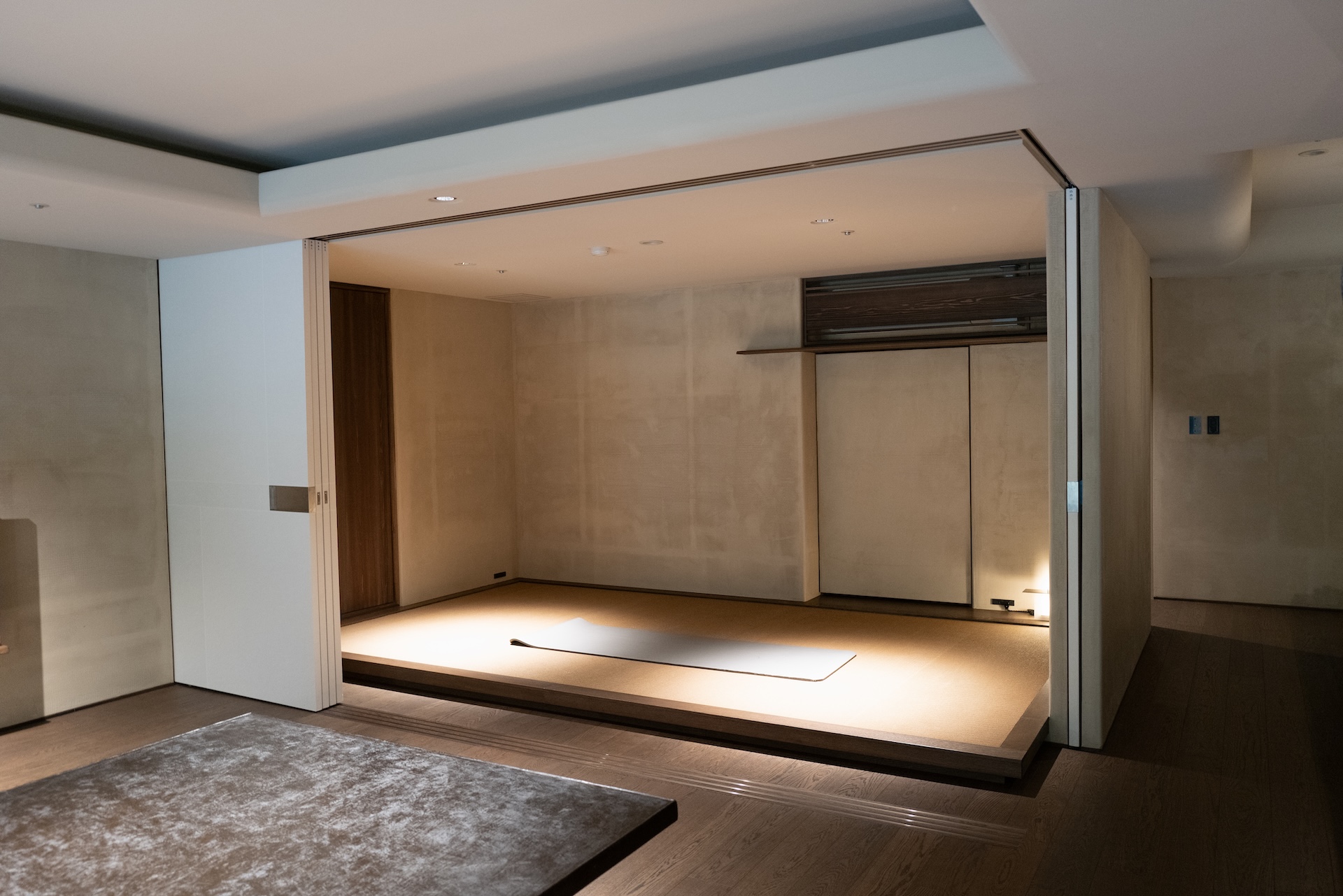 実は、畳スペースは近くで見ると畳ではなさそうです。畳のように見える新素材??。クローゼットにはヨガマットが常備されていて「ここでストレッチしてください」と言わんばかり。実際、寝る前のストレッチにちょうど良い広さでした。布団も収納されており、最大4名まで泊まれる造り。