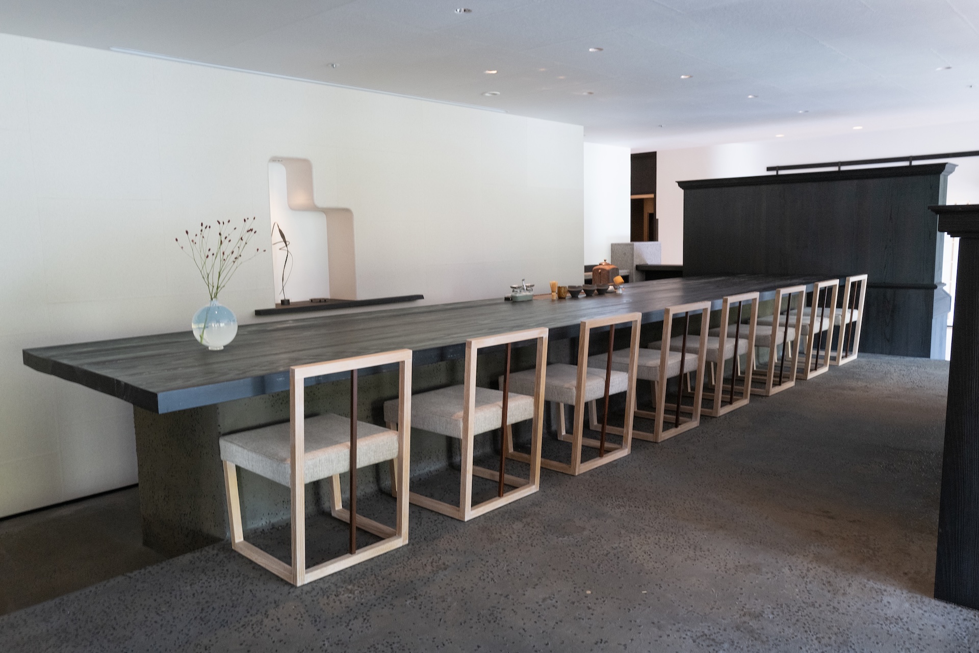 ・大きなテーブルや天井のカーブなど、デザインに“緊張感”がありつつも居心地は損なわない。宿慣れしていても「おっ」と思う仕掛けが随所に。